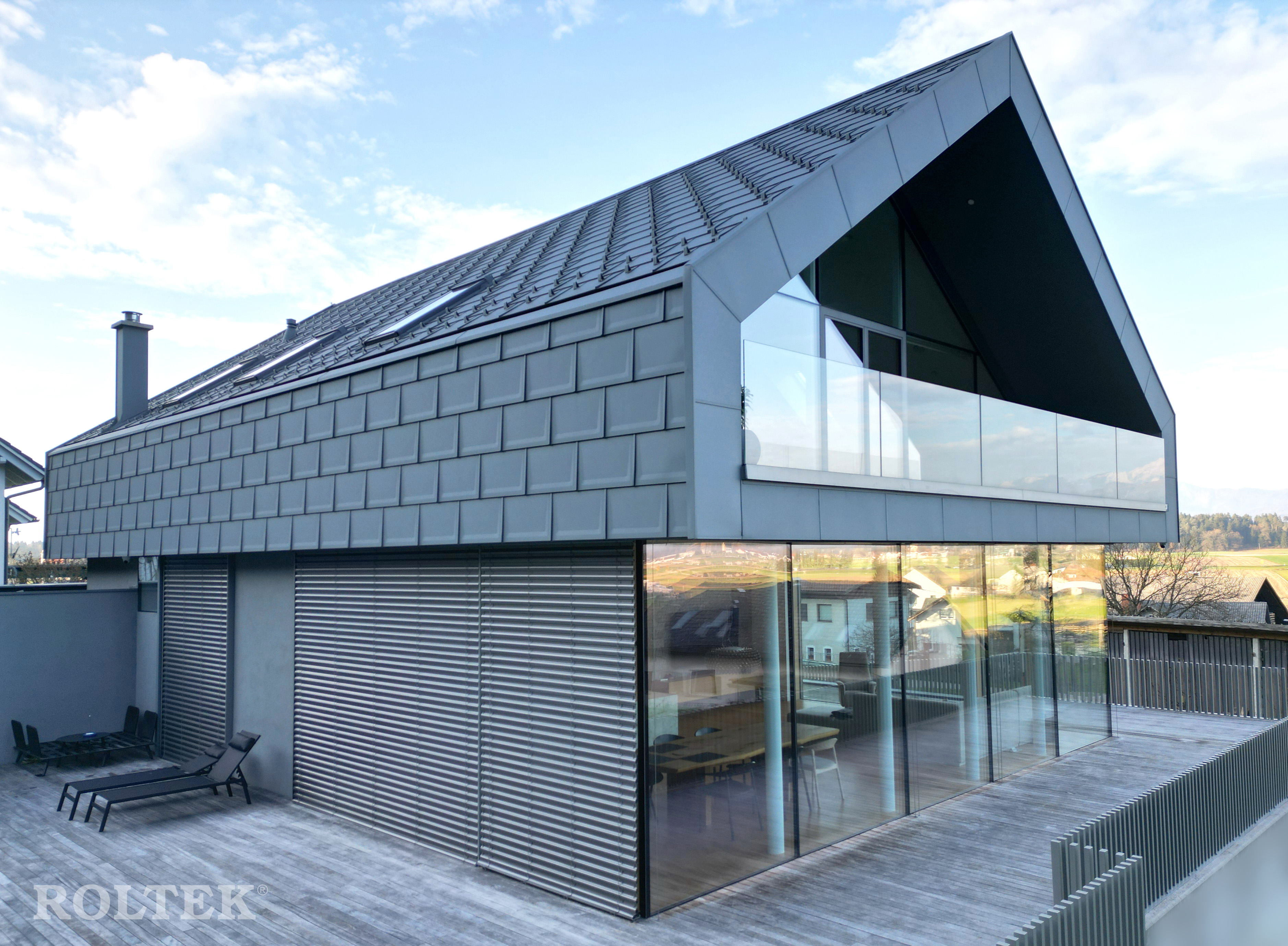 Die HERO-Außenjalousien sind in einem trendigen Graualuminium-Farbton (ähnlich RAL 9007) gehalten und fügen sich nahtlos in die Fassade und das Dach ein. Dank der modernsten Pulverbeschichtungsanlage der Region kann das Unternehmen ROLTEK seinen Kunden jede gewünschte RAL-Farbe für den Sonnenschutz anbieten – ohne verlängerte Lieferzeiten. Im hochgefahrenen Zustand verbergen sich die Jalousien vollständig in der Wand, da sie in kompakte, unterputzmontierte Kästen integriert sind, was zu einer klaren architektonischen Linie beiträgt. Darüber hinaus bieten sie zahlreiche technische Vorteile gegenüber anderen Sonnenschutzlösungen.